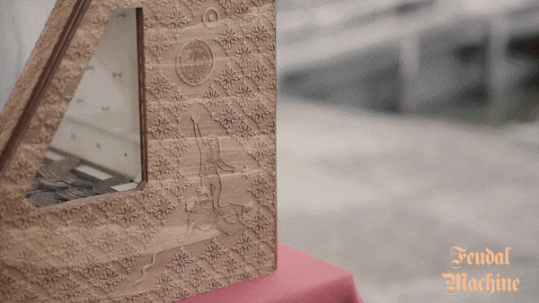 This coin slider does not allow participants to win. It is engraved with a medieval relief sharing the story of digital nobility. Feudal Machine illustrates the insatiable hunger of this system and the unequal distribution of power and wealth.