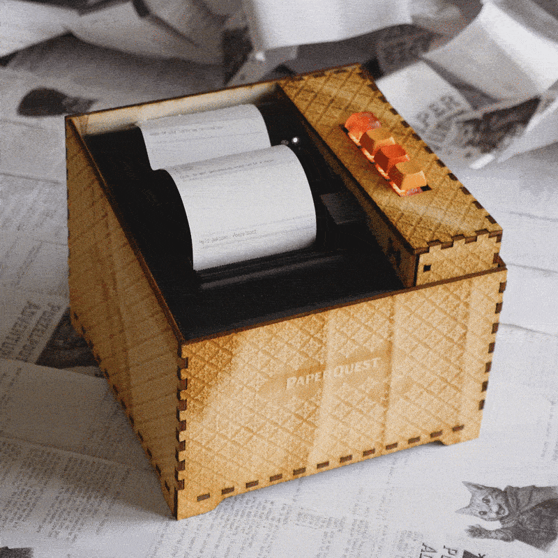 By embedding AI inside a handcrafted wooden device, PaperQuest explores how technology can feel warm, approachable, and magical. The result is a hybrid medium where speculative fiction, nostalgic hardware, and interactive design meet, inviting players to touch, collect, and treasure the stories they create.